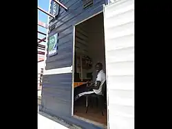 - the shipping containers used to transport the turf have been recycled and reused as the tower element, and have been modified and incorporated alongside the field as an open shaded structure for gathering and storage