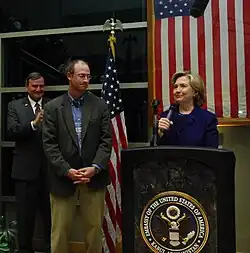 Secretary Hillary Clinton presents the Department of State Award for Heroism to Matthew T. Sherman in Kabul, Afghanistan. November 18, 2009
