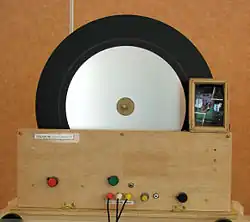 Scottish inventor John Logie Baird in 1925 built some of the first prototype video systems, which employed the Nipkow disk. On March 25, 1925, Baird gave the first public demonstration of televised silhouette images in motion, at Selfridge's Department Store in London.[18] Since human faces had inadequate contrast to show up on his primitive system, he televised a ventriloquist's dummy named "Stooky Bill" talking and moving, whose painted face had higher contrast. By January 26, 1926, he demonstrated the transmission of images of a face in motion by radio. This is widely regarded as being the world's first public television demonstration. Baird's system used the Nipkow disk for both scanning the image and displaying it. A brightly illuminated subject was placed in front of a spinning Nipkow disk set with lenses that swept images across a static photocell. The thallium sulfide (thalofide) cell, developed by Theodore Case in the USA, detected the light reflected from the subject and converted it into a proportional electrical signal. This was transmitted by AM radio waves to a receiver unit, where the video signal was applied to a neon light behind a second Nipkow disk rotating synchronized with the first. The brightness of the neon lamp was varied in proportion to the brightness of each spot on the image. As each hole in the disk passed by, one scan line of the image was reproduced. Baird's disk had 30 holes, producing an image with only 30 scan lines, just enough to recognize a human face. In 1927, Baird transmitted a signal over 438 miles (705 km) of telephone line between London and Glasgow. In 1928, Baird's company (Baird Television Development Company/Cinema Television) broadcast the first transatlantic television signal between London and New York, and the first shore-to-ship transmission. In 1929, he became involved in the first experimental mechanical television service in Germany. In November of the same year, Baird and Bernard Natan of Pathé established France's first television company, Télévision-Baird-Natan. In 1931, he made the first outdoor remote broadcast of The Derby.[19] In 1932, he demonstrated ultra-short wave television. Baird's mechanical system reached a peak of 240 lines of resolution on BBC television broadcasts in 1936 though the mechanical system did not scan the televised scene directly. Instead, a 17.5 mm film was shot, rapidly developed and then scanned while the film was still wet.