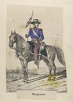 During the 18th century the Spanish colonial forces in the greater Mexico region consisted of regular "Peninsular" regiments sent from Spain itself, augmented by locally recruited provincial and urban militia units of infantry, cavalry and artillery. A few regular infantry and dragoon regiments (e.g. the Regimiento de Mexico) were recruited within Mexico and permanently stationed there.[5] Mounted units of soldados de cuera (so called from the leather protective clothing that they wore)[6] patrolled frontier and desert regions.[7]