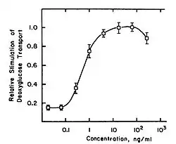 The shape of the 2-DG transport dose-response curve has an optimum at a mezerein concentration of approximately 50 ng/mL. This is atypical, since a dose-response curve usually is S-shaped. The explanation for this behaviour is unknown. Possibly, at high concentrations, mezerein is converted by enzymes that have low affinity for it. That would lower the effective concentration and thus decrease the effects. In this picture, a NOAE-level can be observed between mezerein concentrations of 0 to approximately 0.09 ng/mL. The concentration that gives half-maximal effects is reached for a low concentration of mezerein: about 0.7 ng/mL.