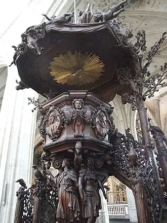 In his pulpits van der Voort achieved the most exuberant expression of the late Baroque in Flemish sculpture. At the end of the 17th century a new design for pulpits had emerged in Flanders. Antwerp sculptor Hendrik Frans Verbruggen was the principal creator behind this new type of naturalist pulpit. In 1696–1699, Verbruggen created a pulpit for the Jesuit church in Leuven, which is now located in the Cathedral of St. Michael and St. Gudula in Brussels. He turned the pulpit into a complex theatrical stage in which at the bottom Adam and Eve are shown driven out of the Earthly Paradise, while the victorious Virgin on top of the pulpit's soundboard crushes the snake slithering from the tree of Good and Evil.[14] In a similar vein van der Voort created a pulpit for the Church of the Abbey of St Bernard near Antwerp in 1713, which is now located in the Antwerp Cathedral. It is decorated with a myriad of plants and animals sculpted in a realistic manner. The supporting column of the pulpit consist of four figures who are representations of the Four Continents.[4] His most exuberant pulpit is located in the St. Rumbold's Cathedral in Mechelen. He created it in 1721 for the abbey of Leliendael. He transformed the structure of a traditional pulpit into a stage for a 'tableau vivant'.[4] The pulpit appears like a free-standing landscape in which a dramatic representation of the conversion of St Norbert takes central place. The saint is shown being thrown from his horse underneath a small mountain. The mountain is brimming with trees, animals and figures that emerge from the background of rough-hewn rocks.[2] The Calvary and the temptation of Adam and Eve are also depicted in the pulpit. The crown of the tree of Good and Evil forms its sounding board. It is no longer possible to distinguish the architectural parts from each other which have become a single whole.[14]