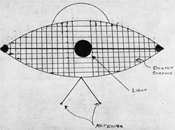 A drawing of a 'football-shaped' UFO with a 'quilted' or 'waffled' texture that reportedly landed in a marsh near Dexter, Michigan on May 20, 1966. It was one of two mass sightings dismissed as being caused by swamp gas.[1]