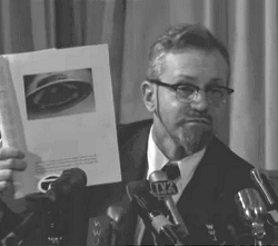 J. Allen Hynek at a press conference on the Michigan UFO sightings at Dexter and Hillsdale, shown here holding up a magazine featuring the Adamski photograph of 1952, after the magazine was handed to him by a reporter.