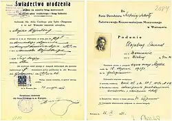 Weinberg's name was registered on his birth certificate as Mojsze Wajnberg. Throughout his adult life, he signed his letters in Polish using the Polish spelling of his surname.[1] During his career in the Yiddish theater of interwar Warsaw, he was known by the German spelling of his name, Mosze Weinberg; a typical convention of the time for Polish musicians who aspired to produce recordings for export.[2] Weinberg adopted the given name Mieczysław professionally at the beginning of his musical career because he believed it sounded more Polish and prestigious.[3]