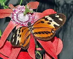 In Dodsonian mimicry, named after Calaway H. Dodson, the model belongs to a different species than the mimic.[86] By resembling the model, a flower can lure its pollinators without offering nectar. The mechanism occurs in several orchids, including Epidendrum ibaguense which mimics flowers of Lantana camara and Asclepias curassavica, and is pollinated by monarch butterflies and perhaps hummingbirds.[87]