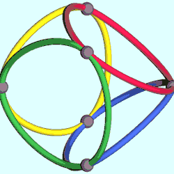 The configuration has maximal symmetry in 3-dimension, and can be seen as 6 circles circumscribe the square faces of a cube. It has 12 sets of pairwise circle intersections, corresponding to the edges of the cube and octahedron. Structurally it has 48 automorphisms of octahedral symmetry.