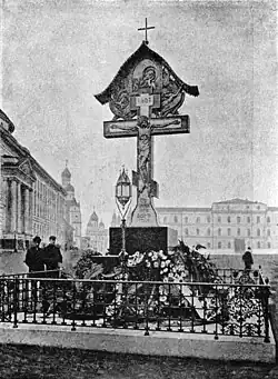 In 1905, Grand Duke Sergei Alexandrovich was assassinated right next to the Kremlin Senate and Nikolskaya Tower, when a terrorist threw a nitroglycerin bomb directly into Sergei's lap, killing him instantly.[1] A monument was later built in 1908 on the exact spot of his assassination, and was later destroyed in 1918 by the Bolsheviks. In 2017, Vladimir Putin made a speech at the unveiling of the reconsecrated monument commemorating Sergei Alexandrovich's assassination. Putin then addressed the history behind the monument, and willingness of the Russian people, especially from Russian artist Viktor Vasnetsov, the original designer of the monument.[2]