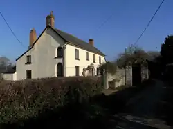 Higher Moorhayes Farm is a grade II listed building, possibly incorporating a 15th century core structure, extensively remodelled in the 19th century. It incorporates fragments of a medieval chapel, which identifies it as the residence of a family of high social status. The earliest surviving dateable feature is of the late 16th century. It is essentially a three-room "cross-passage" house, with the original great hall on the higher side to the right of the screens passage, originally with a fireplace at the higher end. The entrance porch retains a (worn-away) sculpted heraldic shield in the apex, with a reset medieval arch probably taken from the chapel. In the lower end room survives a fireplace with a decorative plaster overmantel displaying festoons and a central lion's head which could be late 16th century, now heavily painted. In the stairwell window survive fragments of late 15th or early 16th century painted glass canopy work, probably from the chapel. The gateway to the garden incorporates re-used medieval material including piers and finials with a lintel with composite roll and concave moulding.[1]