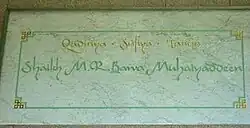 At the peak of the arch above the Arabic Allah, is written the basmala. There is an Arabic Allah inscribed inside a large circle in the center. Below the Arabic Allah are written Quranic verses 35 through 38 from Suratun Nur - Light. Above the left panel is a frame with the words "Qadiriya Sufiya Tariqa" over "Shaikh M. R. Bawa Muhaiyaddeen".