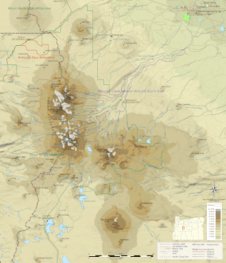 Mount Bachelor is the youngest prominent volcano in the Three Sisters area of Oregon, a group of closely grouped volcanic peaks, in contrast to the typical 40-to-60-mile (64 to 97 km) spacing between volcanoes elsewhere in the Cascades.[14] Among the most active volcanic areas in the Cascades and one of the most densely populated volcanic centers in the world,[15] the Three Sisters region includes peaks such as Belknap Crater, Mount Washington, Black Butte, and Three Fingered Jack to the north, and Broken Top and Mount Bachelor to the south.[14][16] Most of the surrounding volcanoes consist of mafic (rich in magnesium and iron) lavas;[16] only South and Middle Sister have an abundance of silicic rocks such as andesite, dacite, and rhyodacite.[17] Mafic magma is less viscous; it produces lava flows and is less prone to explosive eruptions than silicic magma.[18]