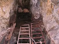 Interior photo of a level mine shaft. The modern ladders are covering a vertical shaft.