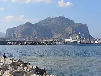 Mount Pellegrino with Palermo Harbor at its feet, seen from the southern coast of the city.