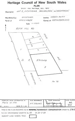 Mulholland's farm house is located on Lot 1 (area of 3 acres 6 roods 1/2 perch) located at the south-west corner of the Smyth's grant. Lot 1 had a water frontage to Brisbane Water, set back by the foreshore reservation of 100', and was bounded by reserved roads on the north (now Elfin Hill Road) and east. While some lots were sold at the time of the auction in 1882, Lot 1 was purchased from Sahl and Nobbs in November 1891 by Charles Thomas Sandon and William Hume for £96/8/11. Sandon later in the same month brought out Hume's interest and at the same time purchased the 100' reservation of land which separated Lot 1 from Brisbane Water. This area had been granted by purchase to Sahl and Nobbs in October 1890 after lobbying the government for rescission of the usual 100' high-water mark reservation. That reservation land became a functional part of the subsequent farm, and the boat shed, wharf, well, road and water pipeline were built on it.[1]