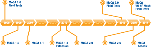 MoCA 1.0 was approved in 2006, MoCA 1.1 in April 2010, MoCA 2.0 in June 2010, and MoCA 2.5 in April 2016.[3] The most recently released version of the standard, MoCA 3.0, supports speeds of up to 10 Gbit/s. This technology is not yet available in customer premises equipment.[6]