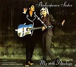 "My 16th Apology" is a song by UK pop duo Shakespears Sister, released in early 1993 by London Records as the fifth and final single from their second studio album, Hormonally Yours (1992). The song was written by the duo's Siobhan Fahey and Marcella Detroit with Richard Feldman, and produced by Alan Moulder. Due to both members being on hiatus at the time, the single performed poorly, suffering from a lack of promotion.[1] The three B-sides, live performances from their 1992 concert broadcast on BBC Radio, were later included on their 2011 album Live 1992. This was the group's last release until 2019 to feature Marcella Detroit.
