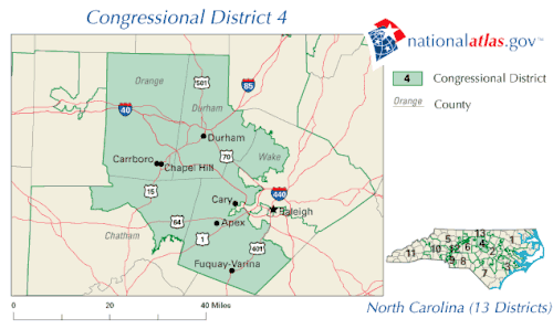 North Carolina's 4th Congressional District (NC-CD4) is located in the central region of the state. The district includes all of Durham County and Orange County as well as northern Chatham County and a portion of Wake County. With a Cook Partisan Voting Index rating of D+23 in 2025, it is one of the most Democratic districts in North Carolina.[2]
