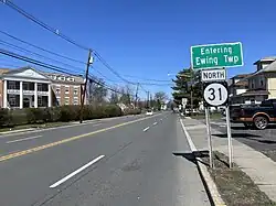 The formation of current-day Route 31 began around 1916, when a portion of the highway, along the community of Hampton was taken over by the state and was repaired to state standards for $300 (equivalent to $5,804 in 2023[9]).[16] In 1923, the state of New Jersey passed the Good Roads Act, which greatly expanded the state highway system in New Jersey. This act took over pre-existing highways and rebuilt them to a standard mandated by the state. Construction began on Route 31 in 1926, when the State Highway Department began work at the southern terminus in Trenton. A total of 11 bridges were constructed along the highway during this time, signifying the route's construction northward. The oldest ones, dating back to 1926, were located in Ewing and Oxford Township. The one in Ewing was along the first portion of the highway to be constructed.[17]