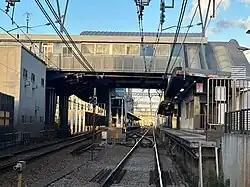 The station consists of single island platform and a single side platform serving three tracks, with the middle track on a passing loop, connected by an elevated station building built over the platforms and tracks.