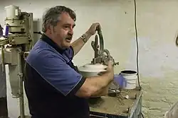 A jigger-and-jolley machine demonstrated by the curator of the Nantgarw pottery museum