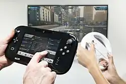 The Wii U-exclusive cooperative "Co-Driver" mode in action. One player drives with the Wii Remote (pictured with the Wii Wheel) while the other provides assistance using the Wii U GamePad.