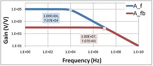 where fC is the cutoff or corner frequency of the amplifier: in this example fC = 104 Hz, and the gain at zero frequency A0 = 105 V/V. The figure shows that the gain is flat out to the corner frequency and then drops. When feedback is present, the so-called closed-loop gain, as shown in the formula of the previous section, becomes
