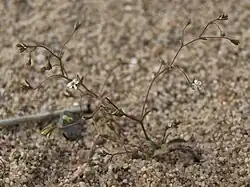 Nemacladus sigmoideus is a species of flowering plant in the bellflower family known by the common name sigmoid threadplant. It is native to the mountains and deserts around the intersection of California, Nevada, Arizona, and Baja California. It is a small annual herb producing a thin, spreading purplish or brown stem no more than 12 centimeters long. Hairy, sometimes toothed oval leaves up to a centimeter long occur at the base of the plant. The inflorescence is a series of zigzagging branches bearing flowers on thin pedicels which are sigmoid in shape. There is a single tiny bract at the base of each pedicel. The hairy flower is under 4 millimeters long. It has five yellow-tipped white lobes.