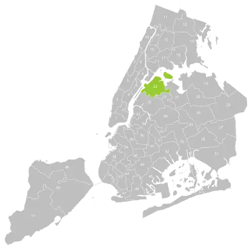 District 22 is based in northern Astoria in Queens, also covering parts of East Elmhurst, and Woodside.[3] Rikers Island, which is officially part of the Bronx, is located within the district.