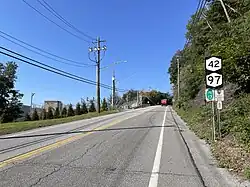 NY 42 begins at an intersection with US 6 and US 209 (Pike Street / East Main Street) in the city of Port Jervis. NY 42 proceeds northwestward, immediately concurrent with NY 97 on West Main Street, a two-lane commercial street through Port Jervis. After passing far east of the Port Jervis station on Metro-North Railroad's Port Jervis Line, NY 42 and NY 97 break off West Main Street for Park Avenue, paralleling the Norfolk Southern Southern Tier Line (ex-Erie Railroad Delaware Division tracks) and Elks–Brox Memorial Park. NY 42/NY 97 continue northwest through Port Jervis as a two-lane wooded road before crossing into the town of Deerpark. In Deerpark, NY 42 and NY 97 are a two-lane commercial roadway alongside the Southern Tier Line, entering the hamlet of Sparrowbush.[3]