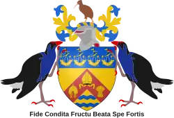 The crest depicts the inverted wing and claw of a hawk, taken from the arms of Edward Hawke, 1st Baron Hawke, holding a wahaika. The supporters are a kiwi on the right side and a lion rampant on the left, both golden. Escutcheon: Barry wavy of six azure and argent a fleece or on a chief of the second three roses gules barbed and seeded proper. Motto: Faith and Courage |