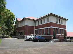 Newmarket State School's new brick school building (now called Block A) was opened on 30 June 1934 by the Minister for Public Instruction (Frank Cooper).[50] It was a two-storey masonry building, constructed from red brick with a darker brick base and pale stucco treatment to the upper floor. It had a hipped roof with gables over the entrances and a prominent ventilation fleche. The main entrance was through a portico with three round arches. Gables featured a half-timbered ornamental effect, utilising timber, fibre-cement panels and terracotta tiles. The building contained 13 classrooms, a head teacher's office, and retiring rooms on both floors. Circulation was provided by an internal staircase at the eastern end and an external timber staircase attached to the western wall. Windows on the southern elevation were protected by terra-cotta tile-clad window hoods. Landscaping in front of the new building including a row of fig trees along the Banks Street fence line (two of which survive), and the laying out of pathways.[51][49][1]