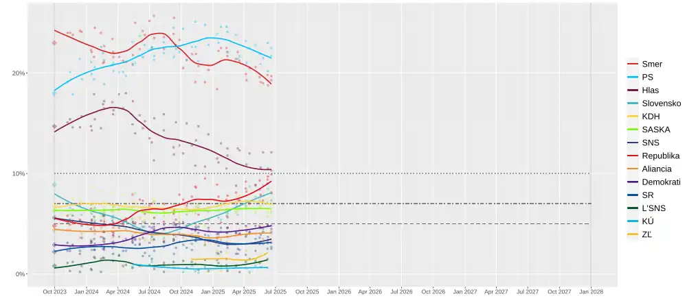 The last elections were snap elections held in 2023. This resulted in a coalition government between Direction – Social Democracy, Voice – Social Democracy, and the Slovak National Party, with Robert Fico becoming the prime minister.[1][2][3]