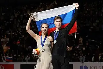 Following a victory at the Russian Cup Final, Sinitsina/Katsalapov were assigned to the 2021 World Championships, to be held without an audience in Stockholm. Four-time and defending champions Papadakis/Cizeron declined to attend due to their own illness with COVID and lack of training time, leading to much speculation that Sinitsina/Katsalapov were the frontrunners to claim the World title.[55] They won both the rhythm and free dances to take the gold medal, setting personal bests for the free dance and total score.[56][57] Their placement combined with the fifth-place finish of Stepanova/Bukin qualified three berths for Russian ice dance at the 2022 Winter Olympic Games in Beijing.[58]