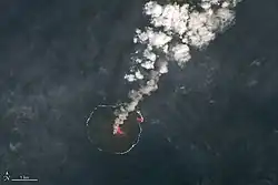 On 14 August 2021, around 6 a.m., artificial satellites confirmed an eruption for the first time since late August 2020. The height of the eruption was about 1,900 m (6,230 ft).[61] On 15 August, the Japan Coast Guard made observations by aircraft, but no eruption was confirmed.[62] On 1 October 2022, satellite images confirmed that Nishinoshima had erupted again and continued to erupt until 12 October, when a Japan Coast Guard aircraft confirmed it was no longer erupting.[63] The ash of the eruption reached a height of between 2.2 and 3.5 km (1.4 and 2.2 mi) on 5–11 October.[64] Foggy weather in Fukuoka Prefecture, Japan, and Busan, South Korea, occurred from late July to early August 2020 due to the volcanic eruption of the island. The PM2.5 concentration increased 6.03 times in Fukuoka and 4.32 times in Busan.[65]