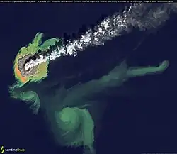 A January 2021 Sentinel-2 image of the island. The discolouration of the water around the island is due to volcanic minerals and seafloor sediment.[69]