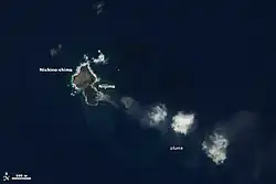 Nishinoshima (Japanese: 西之島; "western island") is a volcanic island located around 940 km (584 mi) south-southeast of Tokyo that is part of the Volcano Islands arc. Nishinoshima is located about 130 km to the west of the nearest inhabited Ogasawara islands, Chichijima Island, hence the name; the other Ogasawara island groups are aligned more to the north–south. The nearest of the other Volcano Islands is over 270 km away, but Nishinoshima is on the alignment of the Volcano Islands.