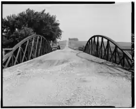 The Nishnabotna River Bridge is located northeast of Manilla, Iowa, United States. It carries traffic on T Avenue over the Nishnabotna River. Steel was in short supply during World War II as a part of the war effort.[2] Many bridges built across the state were built in this era with timber, especially small-scale bridges. Heavy flooding washed out 27 bridges and culverts in Crawford County in May 1945. The county board of supervisors used emergency funds to build new bridges. They bought several steel superstructures from the Des Moines Steel Company to replace the wash-out spans. The bowstring arch-truss structures appear to have been designed by H. Gene McKeown, a civil engineer from Council Bluffs. This bridge is one several similar structures built in the county, and one of five that still remain. The bridge was listed on the National Register of Historic Places in 1998.[1]