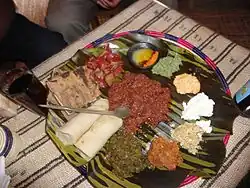 Kitfo is a minced raw beef dish that incorporates niter kibbeh and a spice blend (mitmita).