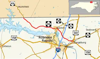North Carolina Highway 46 (NC 46) is a primary state highway in the U.S. state of North Carolina; it is entirely in Northampton County. The route primarily connects the communities on the north side of Roanoke Rapids Lake and Lake Gaston, as well as the north side of the Roanoke River in the county.