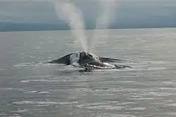 Like the other Eubalaena species, North Pacific right whales are known to interact with other cetacean species. Several observations of North Pacific right whales interacting with groups or solitary humpback whales have been recorded in both the Eastern and Western North Pacific. In 1998 a pair of gray whales was seen showing signs of aggression towards a right whale, chasing it off the coast of California,[37] while in 2012, in the Piltun Bay region of Sakhalin Island's northeast coast, a young adult right whale was seen displaying typical social behavior within a group of critically endangered Western gray whales.[38][39]