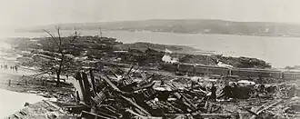 On the morning of the Halifax Explosion, the Ocean Limited had just departed and the local train from Truro had just arrived. The air blast from the explosion collapsed two thirds of the train shed roof. Virtually all the windows in the station were blown away. Doors and walls on the exposed third floor were knocked over and the roof was damaged. In the blizzard that followed the explosion, heating pipes and radiators froze and burst, and portions of the roof collapsed. More significantly, two miles of the approach tracks to the North Street Station were deeply buried in debris and blocked by wrecked railway equipment. This included the destruction on 16% of all the Intercolonial's passenger cars.[7]