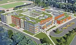 The school is located at the northeast corner of University Boulevard West and Arcola Avenue in Silver Spring, Maryland. The school's architect, William N. Denton Jr., designed a classic H-shaped structure.[16] The original school opened with 55 classrooms, 11 administrative offices, a large gym, and 108 seat library and cafeteria seating 456.[5] Before the end of the first year, plans were made to add an additional 14 new classrooms.[5] Northwood has a recently remodeled multipurpose stadium where their football, soccer, track and lacrosse teams play, named after former Northwood Technology Education, (mostly Electronics) teacher David Kaplan who became an activist lobbying to keep the school open in 1985.[17] The athletic area of Northwood also includes two baseball fields, a track, and a concessions area to the left of the main stands of Kaplan Stadium. The school has a Media Center that mainly serves as a library. There is also a band room, alternate music room, a full wellness center, and a film room that is the location of Northwood's television and radio station, WNHS.