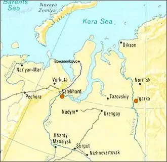 The Obskaya–Bovanenkovo Line is a 572-kilometre long (355 mi) railway line in northern Russia, built and owned and operated by Gazprom.[2] It was opened for traffic in 2010 and was built for the gas fields around Bovanenkovo on the Yamal Peninsula, the Yamal project. In February 2011, it was extended to the Karskaya station, making it 572 km long.[1] Like most railways in the former Russian Empire, it is built to Russian gauge.