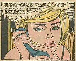 Measuring 91.4 cm × 96.5 cm (36 in × 38 in), Ohhh...Alright... is derived from the June 1963 edition of Secret Hearts #88 by Arleigh Publishing Corp. (now part of D. C. Comics).[5] After 1963, Lichtenstein's comics-based women "...look hard, crisp, brittle, and uniformly modish in appearance, as if they all came out of the same pot of makeup." This particular example is one of several that are cropped so closely that the hair flows beyond the edges of the canvas.[6] The image was featured in the edition of November 8, 1993 of Time, which discussed the 1993 Lichtenstein retrospective at the Solomon R. Guggenheim Museum.[7] It was also the image used to promote the 2012 Lichtenstein retrospective at the Art Institute of Chicago.[8] This was painted at the apex of Lichtenstein's use of enlarged dots, cropping and magnification of the original source.[9]