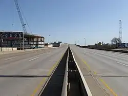 The old I-40 Crosstown Expressway bridge in downtown Oklahoma City, Oklahoma, as shot from the median, looking eastbound. The Oklahoma Department of Transportation hosted a public event on the bridge after traffic had been shifted to its replacement.