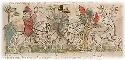 ![]() The murder of Lyut Sveneldich, son of the Kiev voivode Sveneld, by Oleg. Miniature from the Radziwiłł Chronicle (15th century) | |