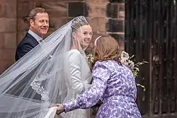 The couple married at Chester Cathedral on 7 June 2024.[8] Henson wore the 1906 Grosvenor Myrtle Leaf diamond tiara by Fabergé for the ceremony.[8][12] The embroidery design on her bridal gown incorporated floral motifs and edgings from the circa 1880 veil worn by her great-great-grandmother Lady Geraldine Mariana Hervey upon her marriage in 1898.[13][14] The Prince of Wales served as an usher during their wedding.[8] Guests included Princess Eugenie and Leonora, Countess of Lichfield.[8] The service was officiated by the Dean of Chester, while the sermon was delivered by the Bishop of Chester.[15][16] As the couple left the cathedral heading towards an awaiting car, disruption was caused by two members of Just Stop Oil.[17]