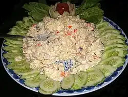 Olivier salad (Russian: салат Оливье, romanized: salat Olivye, ⓘ), also known as Russian salad,[1][2] is a traditional salad dish in Russian cuisine.[2] Its creation is generally attributed to Lucien Olivier.[3][4]