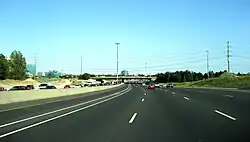 In the interim period, work went into expanding the six lane freeway through Toronto and Markham. A combination interchange was built with the new Highway 407 ETR which opened in June 1997, which as a prerequisite required the realignment of some ramps from the nearby Highway 7 interchange.[29] In early 1998, the MTO announced plans for two contracts to widen Highway 404 south of Highway 7. The first contract converted the grass median into an additional lane in each direction with a central concrete barrier between them, with the inner lanes to eventually be converted into HOV lanes. High-mast lighting was installed in the median barrier, replacing the unique luminaires that were mounted outside of the right shoulder of each carriageway. With the shift in road illumination completed as a prerequisite, the second contract would result in an additional lane in each direction on the outside the existing freeway south of Highway 407, making it ten lanes wide, with expansion of the southbound and northbound lanes completed in 2005 and 2007, respectively.[30][31][32]