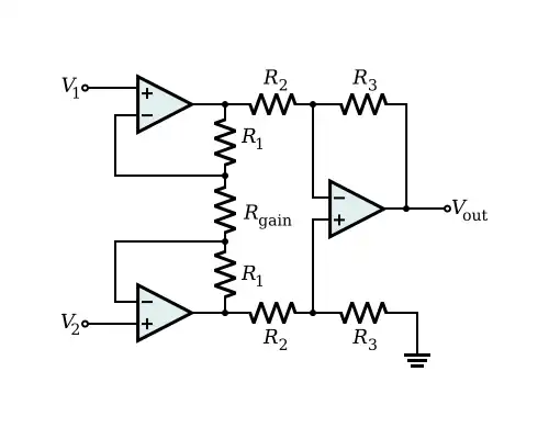 - ^ If you think of the left-hand side of the relation as the closed-loop gain of the inverting input, and the right-hand side as the gain of the non-inverting input, then matching these two quantities provides an output insensitive to the common-mode voltage of and .